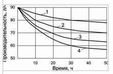 Эффективность обратной промывки зависит от ее интенсивности (при неизменном давлении промывки можно оперировать длительностью обратной промывки) τ и интервала между промывками (продолжительность фильтроцикла) t. При заданном времени τ эффективность работы установки зависит от продолжительности t: чем меньше t, тем эффективнее проходит отмывка мембраны от загрязнений, но тем больше образуется промывной воды. Исследования по оптимизации процесса обратной промывки ставят целью определить такие значения τ и t для различного состава обрабатываемой воды, которые соответствуют наибольшему количеству очищенной воды, полученной в течение времени Т. Исследования проводятся на модельных растворах хлорида железа (III). На рис. 1 показано снижение производительности мембранного аппарата с течением времени для разных концентраций железа в исходной воде.