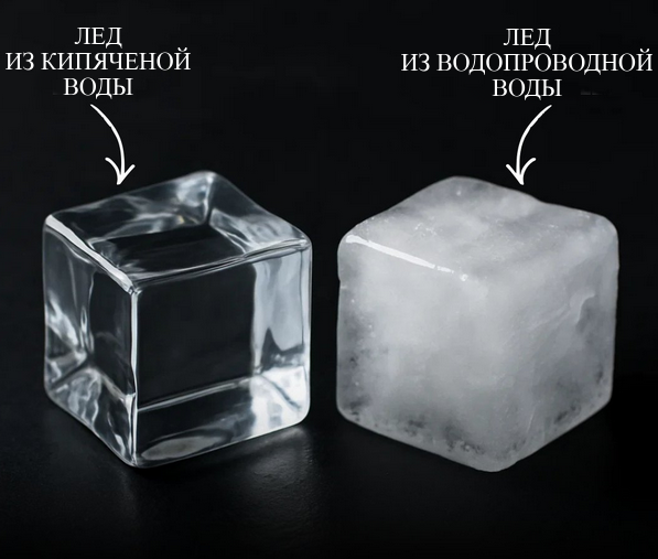 Почему лед, приготовленный из водопроводной воды, мутнеет, а кипяченая вода при замораживании становится совершенно прозрачной? Откуда берется этот молочный оттенок у льда из водопроводной воды?