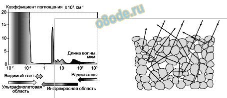 Рис. Слева - Видимый свет льдом практически не поглощается, но задерживает весь ультрафиолет и большую часть инфракрасного излучения. В этих областях спектра лёд выглядит абсолютно чёрным. Справа - Белый свет, падающий на снег, не поглощается, а многократно преломляется в ледяных кристаллах и отражается от их граней. Поэтому снег выглядит белым.