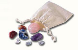 Льняной мешочек содержит горный хрусталь, сердолик, аметист, яшму, розовый кварц и содалит.
