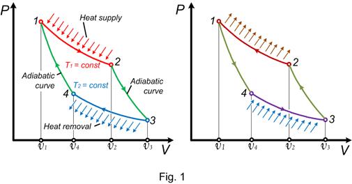 In modern stationary heat and power engineering basically steam thermal power plants are used. Thermal power plants, in which steam is applied as a working medium, have good advantages distinguishing them from thermal power plants with a gaseous working medium. It should be reminded, that cycle Карно consists of two adiabatic curves and two isotherms, the temperature of a working medium should differ from the source temperature by infinitesimal value. In case of a substance flow, the most technically simple solution is for heat supply and removal is isobar process. This is the process of phase transition of pure liquid substance into a gaseous state. Inside double-phase area the state of a pure substance isobars coincide with isotherms; hence, isobar process of heat supply to moist steam (i.e. steam formation), and isobar process of heat removal from moist steam (condensation), easily implemented in practice, are isothermal processes at the same time. It can be concluded that if moist steam is used as a working medium and a cycle consisting of two adiabatic curves and two isobars (which are isotherms at the same time) is implemented the Carnot cycle is obtained. The discussed practical steam-power cycle is steam power cycle which is carried out by HEIC (see Fig. 1).