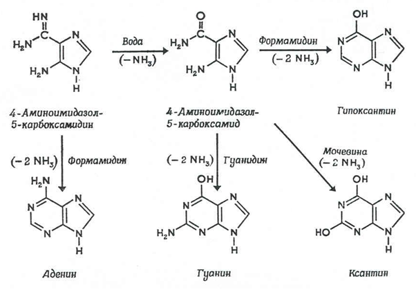 Рис. 3. Предполагаемые механизмы образования пуринов – аденина, гуанина и ксантина из водной смеси NH3 и HCN (вверху) и аденина из водной смеси NH3-HCN (внизу) при +95 0С. (суммарная реакция: 5HCN = аденин) [15]. Промежуточные продукты синтеза – 4-аминоимидазол-5-карбоксамидин и 4-аминоимидазол-5-карбоксамин детектировались в растворе.