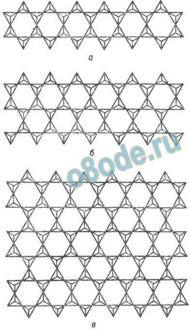Рис. Конденсация пироксеновых кремнекислородных анионов в сотовые двухрядные амфиболовые (а), трехрядные амфиболоподобные (б), слоистые тальковые и близкие им анионы (в).