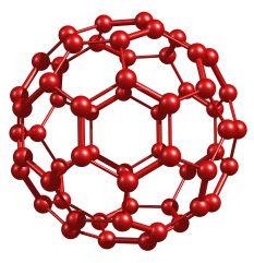 Самый симметричный и наиболее полно изученный представитель семейства фуллеренов — 60-ти углеродный фуллерен (C60), в котором углеродные атомы образуют многогранник, состоящий из 20 шестиугольников и 12 пятиугольников и напоминающий футбольный мяч (рис. 4). Каждый атом углерода в молекуле C60 находится в вершинах двух шестиугольников и одного пятиугольника и принципиально неотличим от других атомов углерода. Атомы углерода, образующие сферу, связаны между собой сильной ковалентной связью. Толщина сферической оболочки 0,1 нм, радиус молекулы С60 0,357 нм. Длина связи С—С в пятиугольнике - 0,143 нм, в шестиугольнике – 0,139 нм.