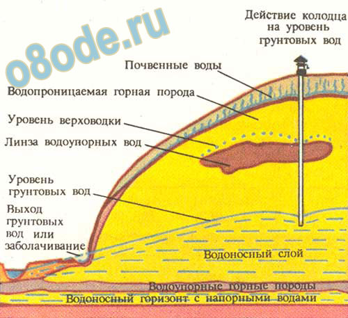 По условиям залегания выделяют три типа подземных вод: верховодку, грунтовые и напорные, или артезианские.